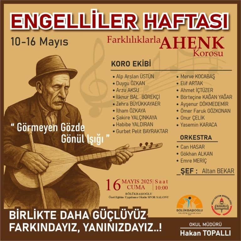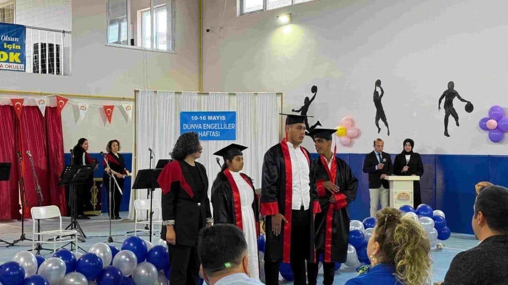 10-16 Mayıs engeliler haftası etkinliklerimiz okul müdürümüz Hakan TOPALLI haftanın anlam ve önemini belirten konuşması ile başlayıp, Sayın Mutlu KÖKSAL, Sayın Muhsin DERE ve Sayın Suat ARSLAN 2025 yılında mezun olacak öğrencilerimize plaketlerini ve hediyelerini sundu. Farklılıklarla Ahenk Korosu güzel türkülerimiz ile coşkuyu en üst seviyeye ulaştırdı. Program bittikten sonra El Sanatları öğretmenlerimiz Alp Arslan ÜSTÜN ve Zeynep ÜNAL ’ın öğrencilerimizle birlikte hazırlanan ürünlerin sergisi protokol üyeleri tarafından gezildi.